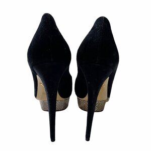 Almond toe suede pumps with metal stud platform