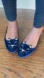 Chic navy velvet loafers with playful cat face design. Ideal for a fun, stylish look.