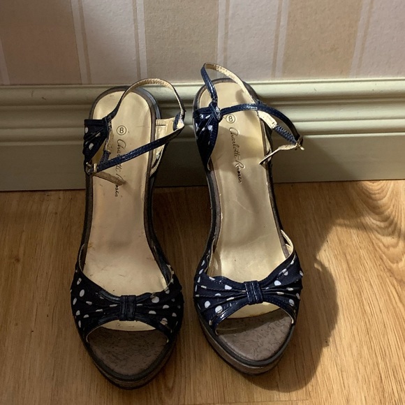 Has a nice wedge, and the souls of the shoe are a little scratched up and damaged as you see in the picture