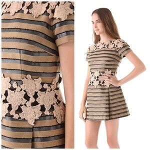 Mix of textures. Gleaming lame and soft tweed. Felted lace appliques trim the neckline and waist. Hidden zip. Lined body. Semi-sheer yoke.