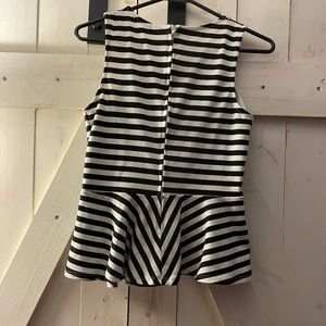 Sleeveless black and white striped baby doll blouse. Has a zipper in the back. The tag says Large but it would fit more small or 4-6.