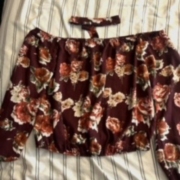 Maroon floral off the shoulder shirt with neck strap attached to the shirt, used