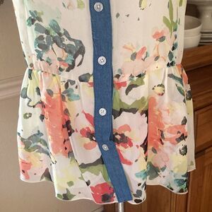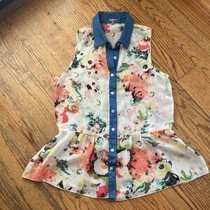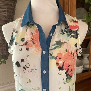 Charlotte Ruse Floral Watercolor Sheer Button Up Sleeveless Shirt Size Medium