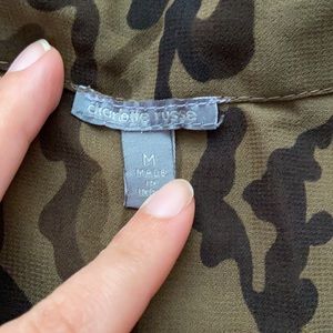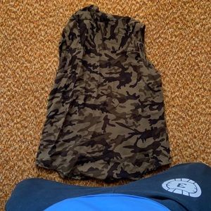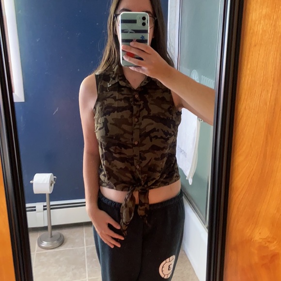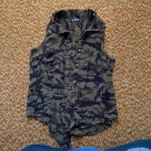 Camo button down tie in the front top in great condition. Thin material