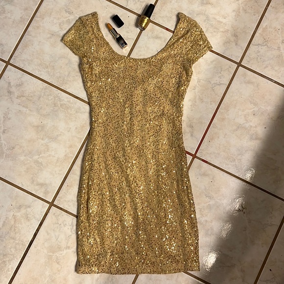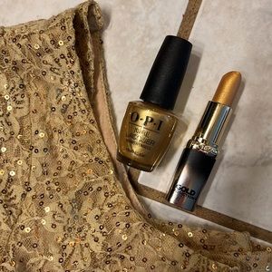 Charolette Russ Gold sequin party dress size Small. L’Oréal Gold Lipstick. Gold O.P.I nail Polish.