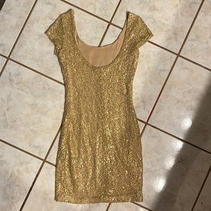 Charlotte Russ Gold sequin party dress. Gold lipstick. Gold nail Polish