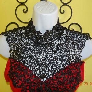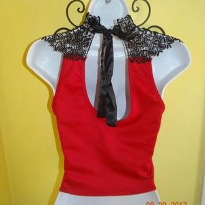 This item is used but in good condition. Charlotte Russe Black and Red Crochet Crop Top in woman's size small. It has a black satin ribbon on the back to tie. Beautiful crocheting pattern.