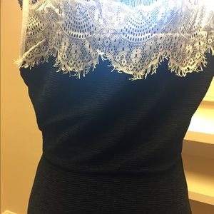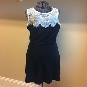 Black dress, white lace 96% polyester, 4% spandex, lace is 100% nylon, machine wash cold, fabric is stretchy, worn once