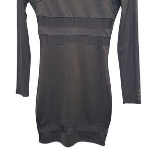 Charlotte Russe Black Long Sleeve Bodycon Sheer Cutout Mini Dress M. Front squared neckline & a V back gold zipper closure. Sleeves and areas on the body are a sheer mesh material.