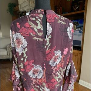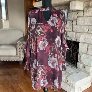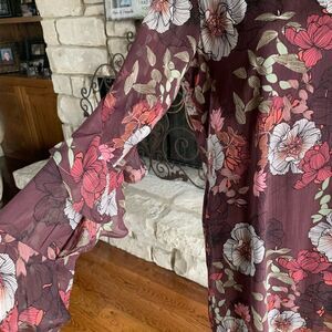 Bohemian chic sheer floral print dress fully lined long layered bell sleeves one button closure in the back ( color may vary due to lighting) great preloved condition smoke/pet free
