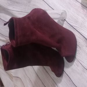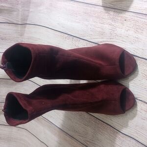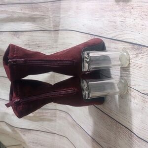 Elegant burgundy heeled boots. Features a clear block heel. Perfect for stylish outings.