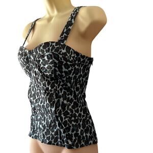 Blue and gray cheetah animal print woven camisole blouse with padded bra area, side zipper, boning and elasticized smocked center back