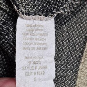 Charlotte Russe women’s open-front cardigan in size S, made in the USA. Features bold black and beige chevron stripes, lightweight acrylic knit, and ribbed trim. Flowy, draped fit perfect for layering year-round. Pre-owned with typical light wear, no major flaws noted.