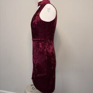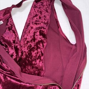 Jewel toned crushed velvet faux wring bodycon mini has perfect mix of festive sparkle and sultry elegance. Plush crushed velvet catches the light while the choker neck and deep plunge give it a bold modern edge. The ultimate winter party statement - rich wine-red dress made for holidy soirees, NewYears Eve celebrations, an every night out moment where you want to feel luminous, confident and unforgettable. Exposed gold back zipper accent adds just the right glimmer touch.