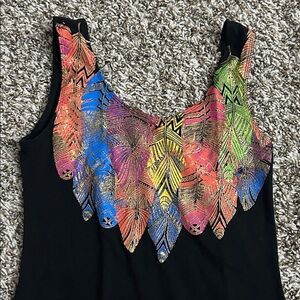 This chic Charlotte Russe bodycon dress features a vibrant multicolor feather-inspired print around the neckline