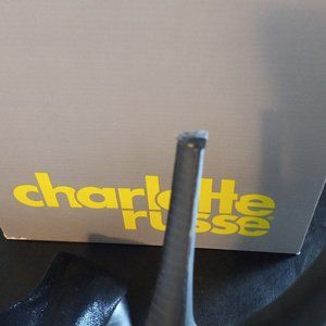 Charlotte Russe Ella Stle Black Peeptoe Pumps Size 7. The shoe has a suede light sparkle feel to them and black ribbon ties. 4" heel.