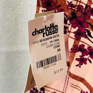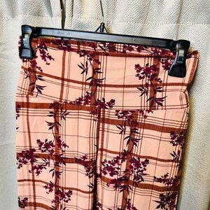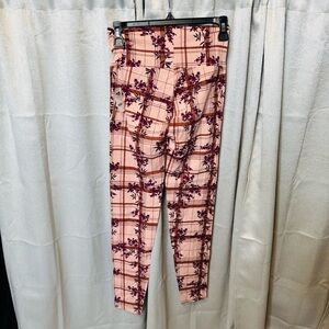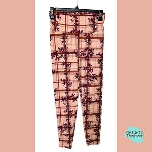 Chic leggings featuring a floral plaid design in pink and brown. Ideal for casual outings. New with tags. Size medium. Made of cotton and spandex. Inseam 27 1/2 inches. 26 inch waist measurement measurements are approximate.