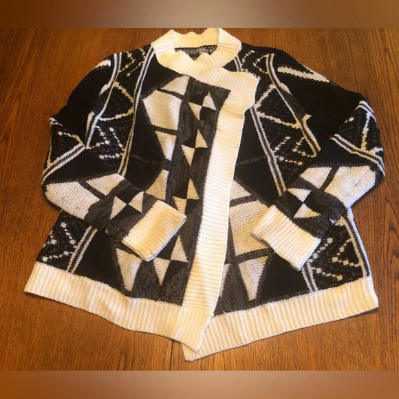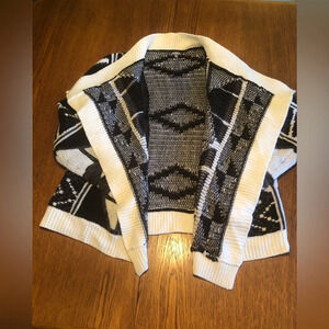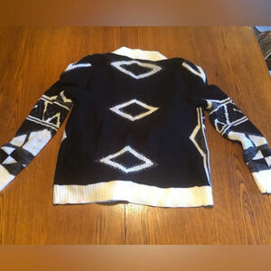 100% acrylic. Good condition, no holes or rips. Please see all photos. Size small. Small bits of fabric pilling on sleeves but still really nice. Measures about 23” long. Always open to offers!