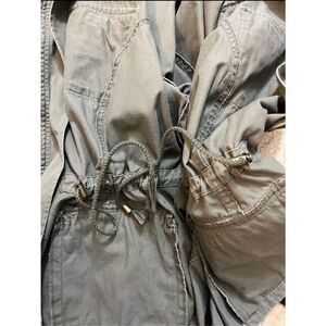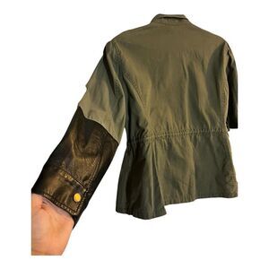 Charlotte Russe Green Military Jean Jacket Plus Size 2X Faux Leather Sleeve, collared, flap pockets, drawstring waist, zipper & snap closure.