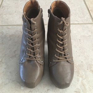 Beautiful bootie from Charlotte Russe!! Worn once! Heel is about 4 1/2 inches! May look high and uncomfortable but it's on the contrary shoes are VERY comfortable and because of the thick heel no signs of a future rolled ankle!! BUNDLE TO SAVE!!
