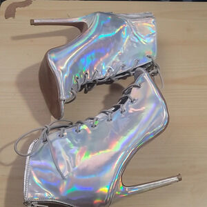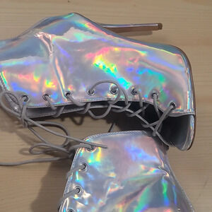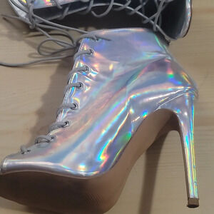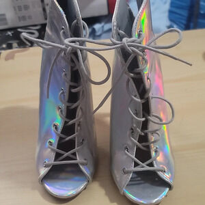 Sexy Charlotte Russe Miley silver holographic lace up high heel ankle bootie boots heels 7. Heel measures approx. 4.5". Check out our closet and bundle to save 💵. Bundles over 5 lbs will require purchase of extra postage, offers always welcome 😊Non-smoking cat friendly home 😻Bookmark our closet as new items added weekly 💕thank you for shopping our closet,