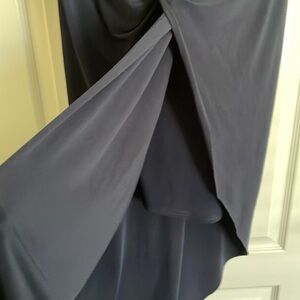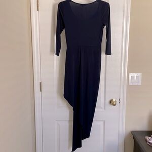 In great used condition. This is a navy blue, not black like it looks in the pictures. Only wore twice. Very sexy with a short skirt underneath the longer portion to one side. This dress has a lot of stretch and shows off all the curves. Measurements are approximately 30” in length for the short part of the dress and the side train is approximately 48” in length. Armpit to armpit is approximately 15” and the waist is approximately 13”. 95% polyester and 5% spandex. Bundle with other items for additional savings and feel free to make offers 😊