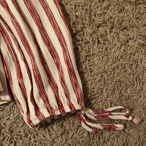 Super cute off the shoulder blouse from Charlotte Russe! It’s white with red stripes and has ties on the sleeves. Size small!
