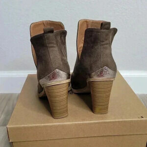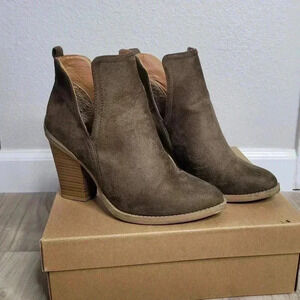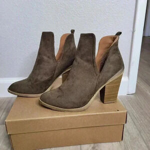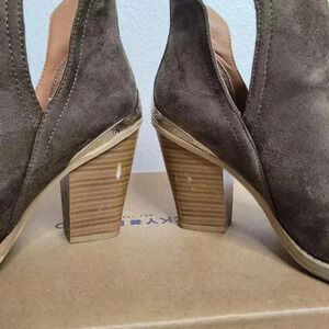 Faux Suede in a pretty olive green color, with a wood block heel. Pointed toe with a cute metal detail on the heel.