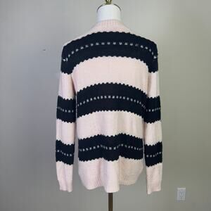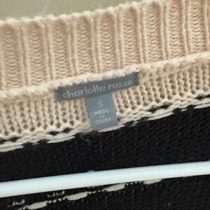 The Charlotte Russe Cardigan offers versatile layering with its open front design and classic long sleeve construction. This cream and black sweater features a relaxed fit and comfortable stretch fabric, perfect for transitional weather or casual ensembles. Note the minor pilling on this otherwise cozy garment. The neutral color combination and easy drape make it ideal for pairing with various outfits, providing effortless style for everyday wear or relaxed occasions.