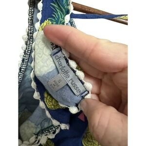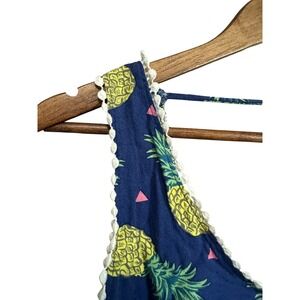 Keywords: pineapple crop top, racerback tank top, summer top, beach top, blue and yellow top, crochet trim top, Charlotte Russe top, women's crop top, casual top, sleeveless top, printed top, festival top