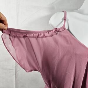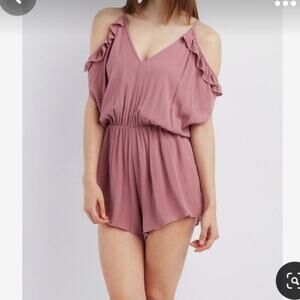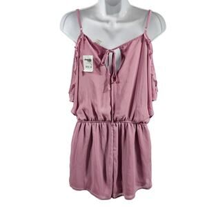 This is a BRAND NEW romper in a pretty pink/mauve color. It has spaghetti straps over the shoulder and the sleeves are worn off the shoulder. Since the fabric is sheer, there is a polyester lining on the inside. Size Small.