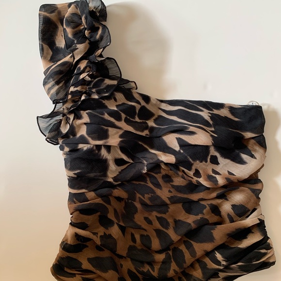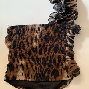 Ruffled shoulder, ruched detail, elastic back, animal print, size small. Excellent condition