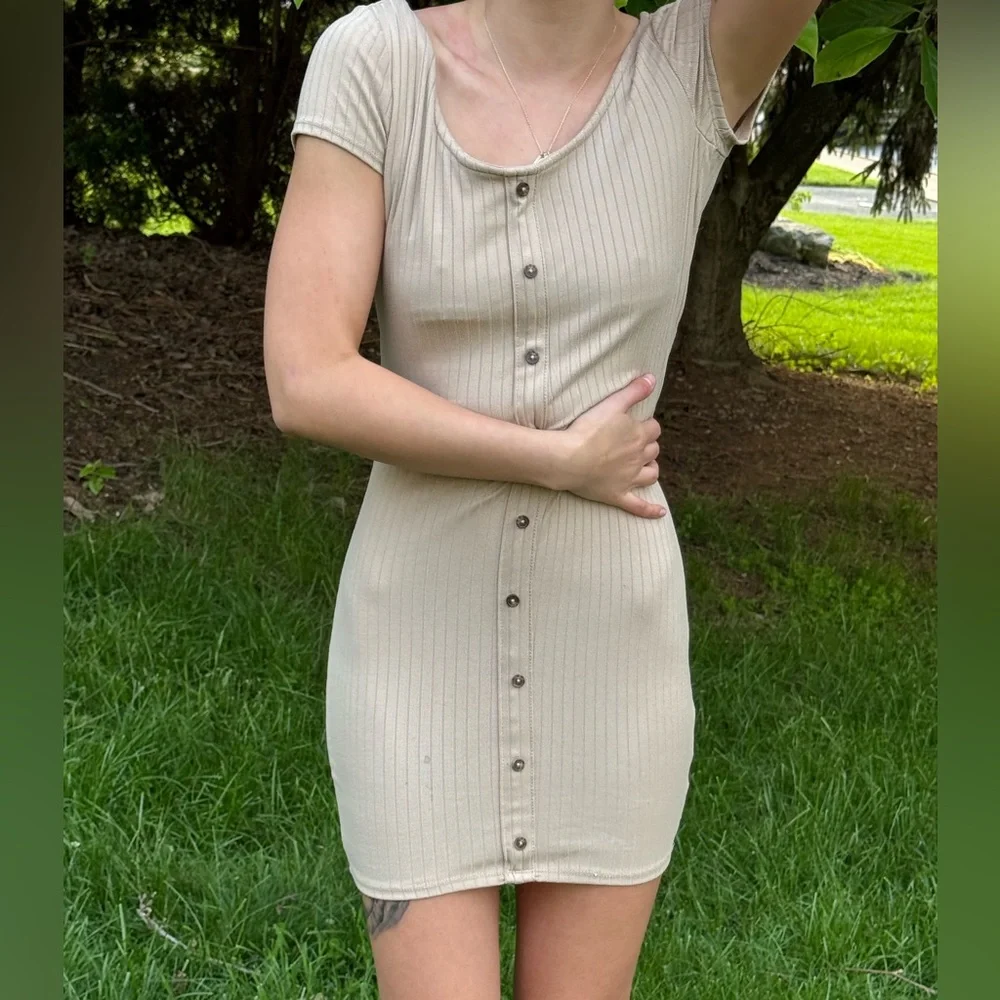 This casual bodycon dress by Charlotte Russe features a ribbed texture and a scoop neckline, perfect for a laid-back yet stylish look. The tan color and short sleeves make it versatile for various occasions, while the mini length adds a trendy touch.