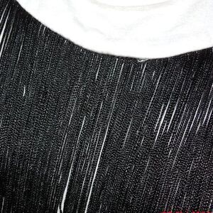 T-shirt type fabric so it flowy and comfy all in one. Cute and stylish for a night out. The scoop of the neck comes up to the back with 2 small buttons and hole in the back. Off-white in color with black fringe. This is a stretchy shirt, and the measurements are unstretched.