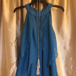 NWOT Fully lined soft-flowing tunic. Super-cute surprise bow in the back! (There's a V opening with fabric tassels to make a bow.) Size Small, 100% polyester, tag suggests to hand wash cold and line dry. About 17" from armpit to armpit 24.5" from collar to hem.