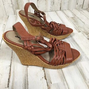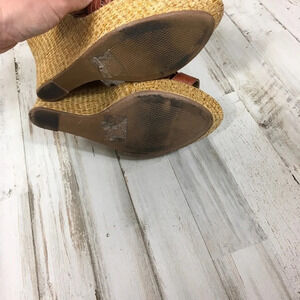 Charlotte Russe brand tan and brown wedge sandals, size 9. Basket weave style wedged heel with strap around ankle. In good used condition with no major flaws. All items are from a pet free, smoke free home and will ship same or next day.
