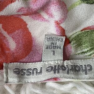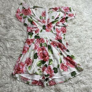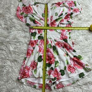 The Charlotte Russe White Floral Romper in size Large is a stylish one-piece outfit designed for women. The romper features a floral pattern on a white background, making it a feminine and elegant choice for various occasions. With a regular fit and a flattering romper style, this piece embodies a trendy and chic look that is perfect for those who love fashion-forward clothing options. Ideal for pairing with sandals or heels, this romper is a versatile addition to any wardrobe.