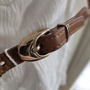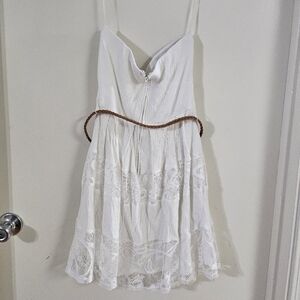 Elegant strapless dress with lace details. Features a brown belt accent. Perfect for summer occasions, bridal shower, or date night!