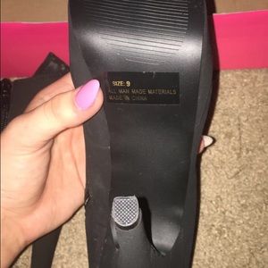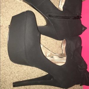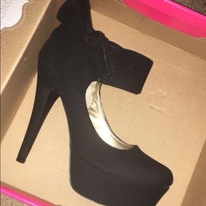 Tall heels, only worn once (indoors), black, and have bows on the side.