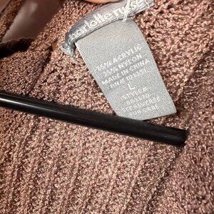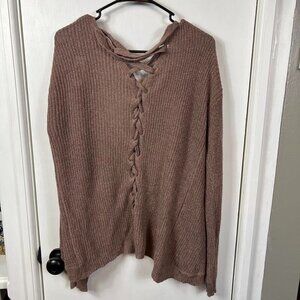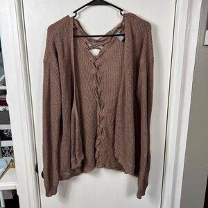 Charlotte Russe brown knit cardigan. Back has lace up cut out. Open front, no pockets. Long sleeve. 75% acrylic 25% nylon. Size L