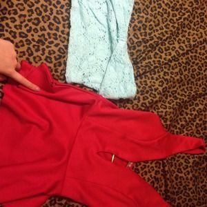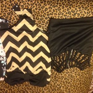 Cute clubbing shirts including a black and beige chevron body suit, a tribal peplum 1/2 sleeve shirt, a blue lace floral croptop with bow, a black croptop with cool neckline. A black floral peplum shirt, and a red low cut shirt with gold bars ( has a small hole shown in the picture) all worn a few times size small cute for a night out!
