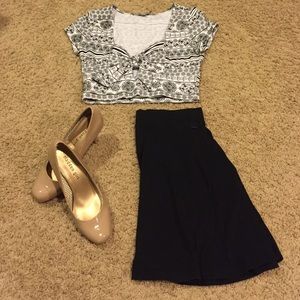 Very cute Charlotte Russe crop top, with a fun floral/striped pattern! Only worn once or twice, in excellent condition. It is low cut, with a tie in front and a little gather accent in the front. Would be ADORABLE paired with a skirt, or high waisted pants.