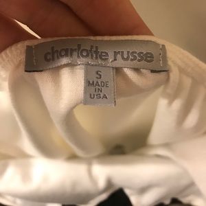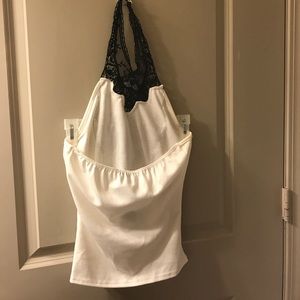 White halter top with black lace detail. Buttons around the neck and is tight fitting. Black lace is not see through.