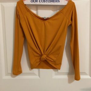 This was purchased from Charlotte Russe. I took the tags off and decided I didn’t like the color on me. It’s a really cute top for high waisted shorts or jeans. It’s very soft! Never been worn! You can wear this with the little knot shown or without.