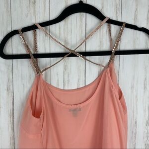 Charlotte Russe peach sequin sparkle strappy tank. Size small. Such a pretty color. Can wear the criss cross strap in the front or back. Gently preloved in great condition.