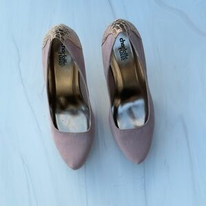 The shoes are pink, faux suede pumps with a snakeskin print detail on the heels and platform. They are described as stilettos in a dusty rose color.