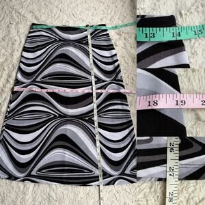 Charlotte Russe vintage Y2K 90s psychedelic op art print midi skirt patterned. Made in the USA! Black, grey and white colors. High rise waist waisted. Very stretchy. Mild signs of wear in the fabric as detailed. Cute for going out, rave, clubbing, clubwear, euro trash. Polyester and spandex blend. Gently used preowned vintage condition.