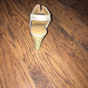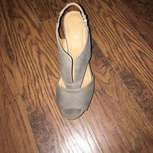 Gray faux leather wedges. Size 8. Adjustable back. Open slit front. Very cute on with a dress or skinny jeans.