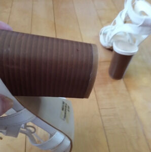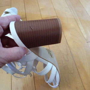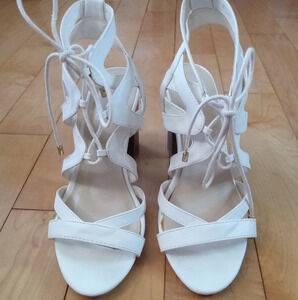 Charlotte Russe white lace up cage block heel sandals women's size 8. Made from man made materials. Good pre-owned condition with a few scratches on heel block, see pics. The laces could use a cleaning.