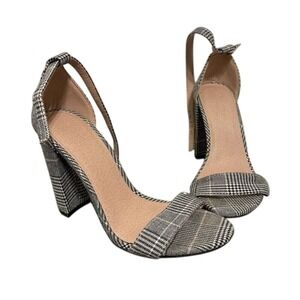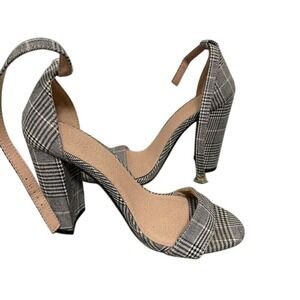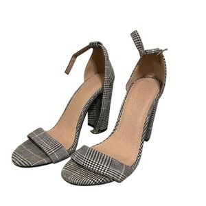 Keywords: plaid heels, ankle strap heels, block heel sandals, open toe heels, high heel sandals, women's heels, party heels, casual heels, gray heels, white heels, plaid shoes, dressy sandals, fashion heels, stylish heels